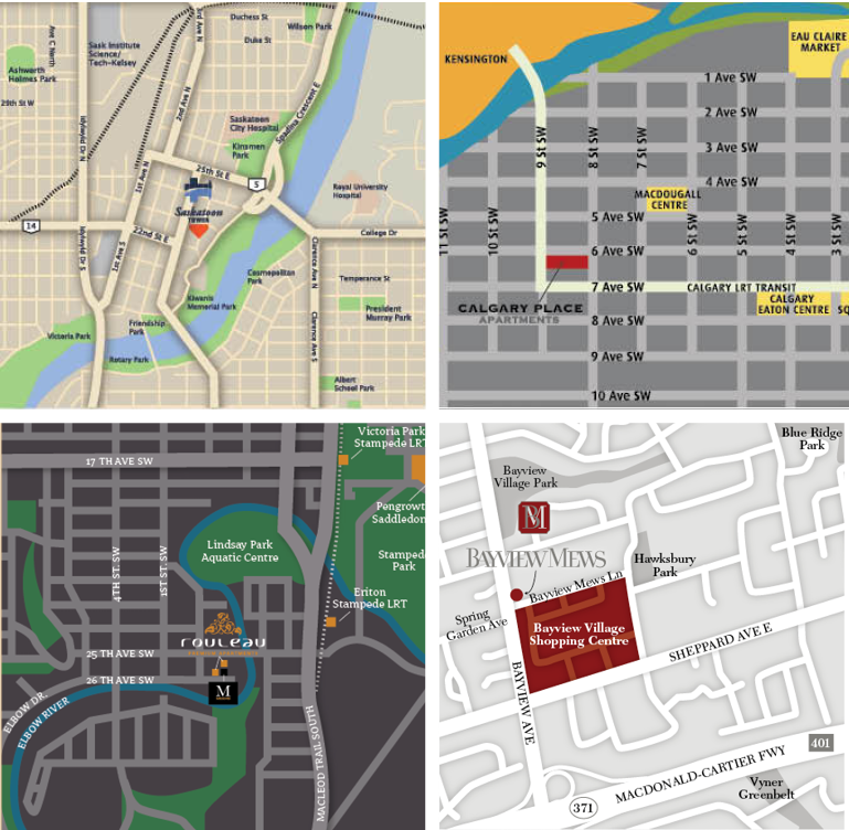 Maps created for real estate and apartment rental marketing pieces.